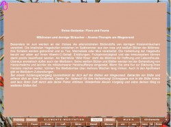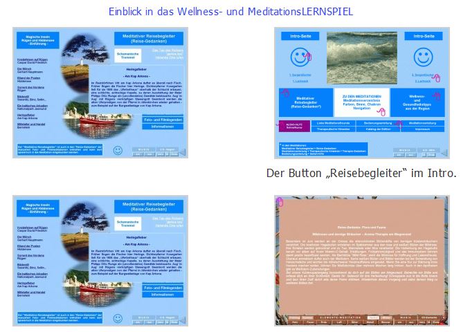 Sie können im „Wellness- und MeditationsLERNSPIEL“ per Mausbewegung in die linke obere Ecke die „Gedanken“ öffnen. Dabei werden Sie in allen Foto-Meditationen mit Hilfe der „Reise-Gedanken“ quasi durch die Region gelotst und in allen Farb- und Formmeditationen mit Hilfe der Therapie-Gedanken durch die Meditationsanleitung sowie die Therapeutischen Hinweise.