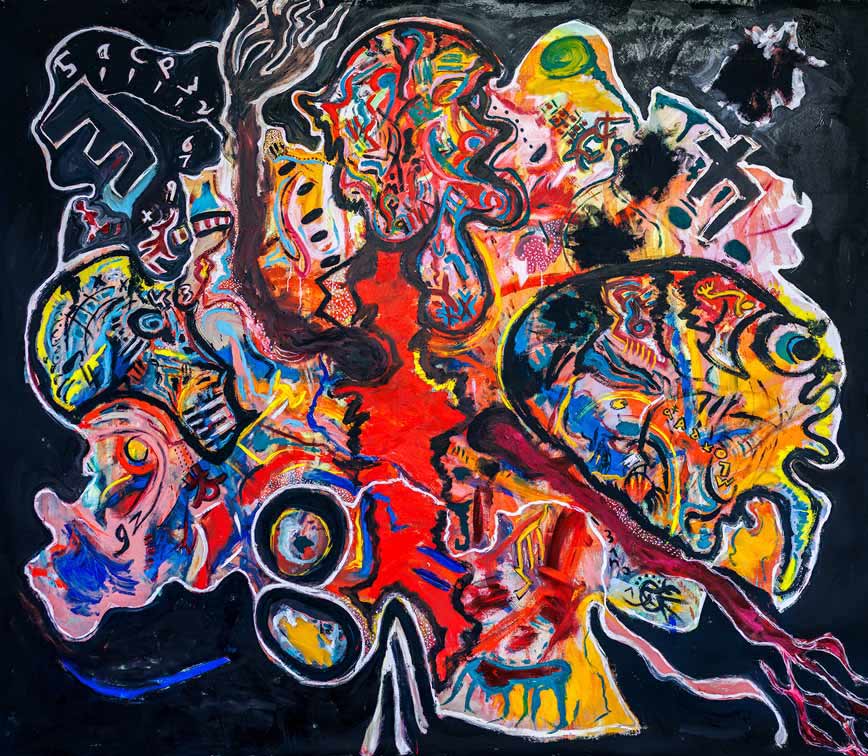 - Jamy Kahn, USA, Balletree, 2013 – 2019, acrylic on canvas on wood; 3-dimensional shaped construction, 210.82 „H x 185.42″W x 7.62″D cm