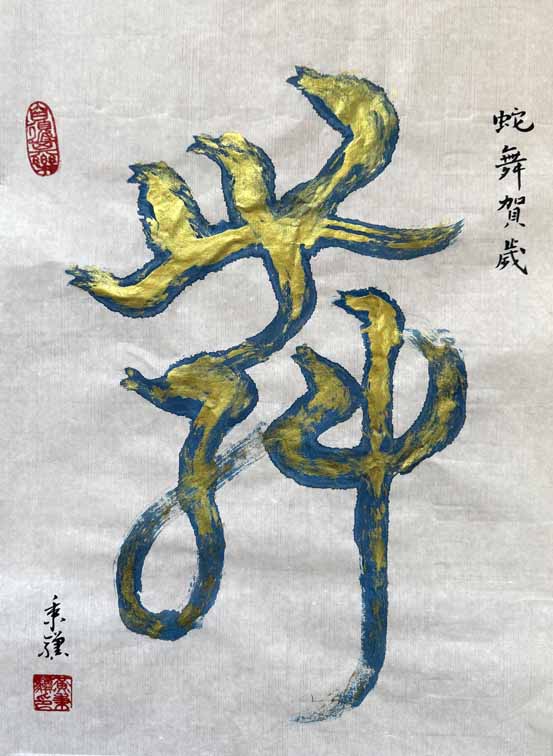- Bing Huang, USA, Snake Dancing (cursive script), 2025, colors and gold leaf on rice paper, 14 x 191/2 cm