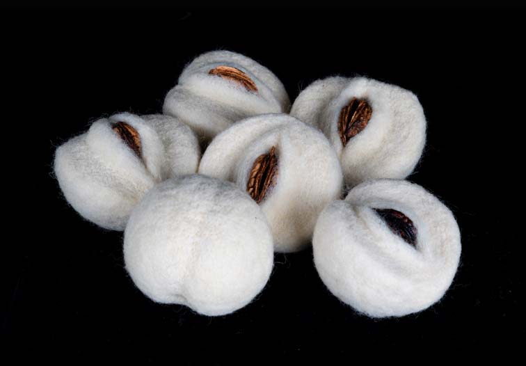 - Aomi Kikuchi, Japan, Six Peaches, 2023, wool fiberpeach seed, 12 cm diameter